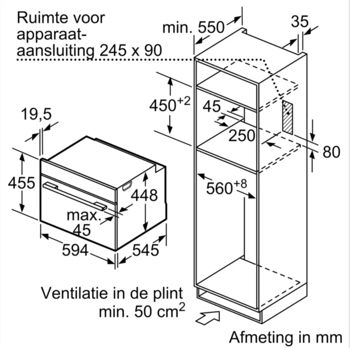 Inbouwafmetingen (HxBxD): 450-450 x 560-560 x 550 mm